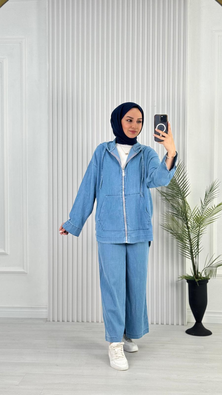 Tencel kumaşından üretilen bu özel takım, denim görünümü ile spor rahatlığını bir araya getiriyor. Geniş beden aralığı ve rahat kesimi ile her vücut tipine uyum sağlayan modern tasarım.