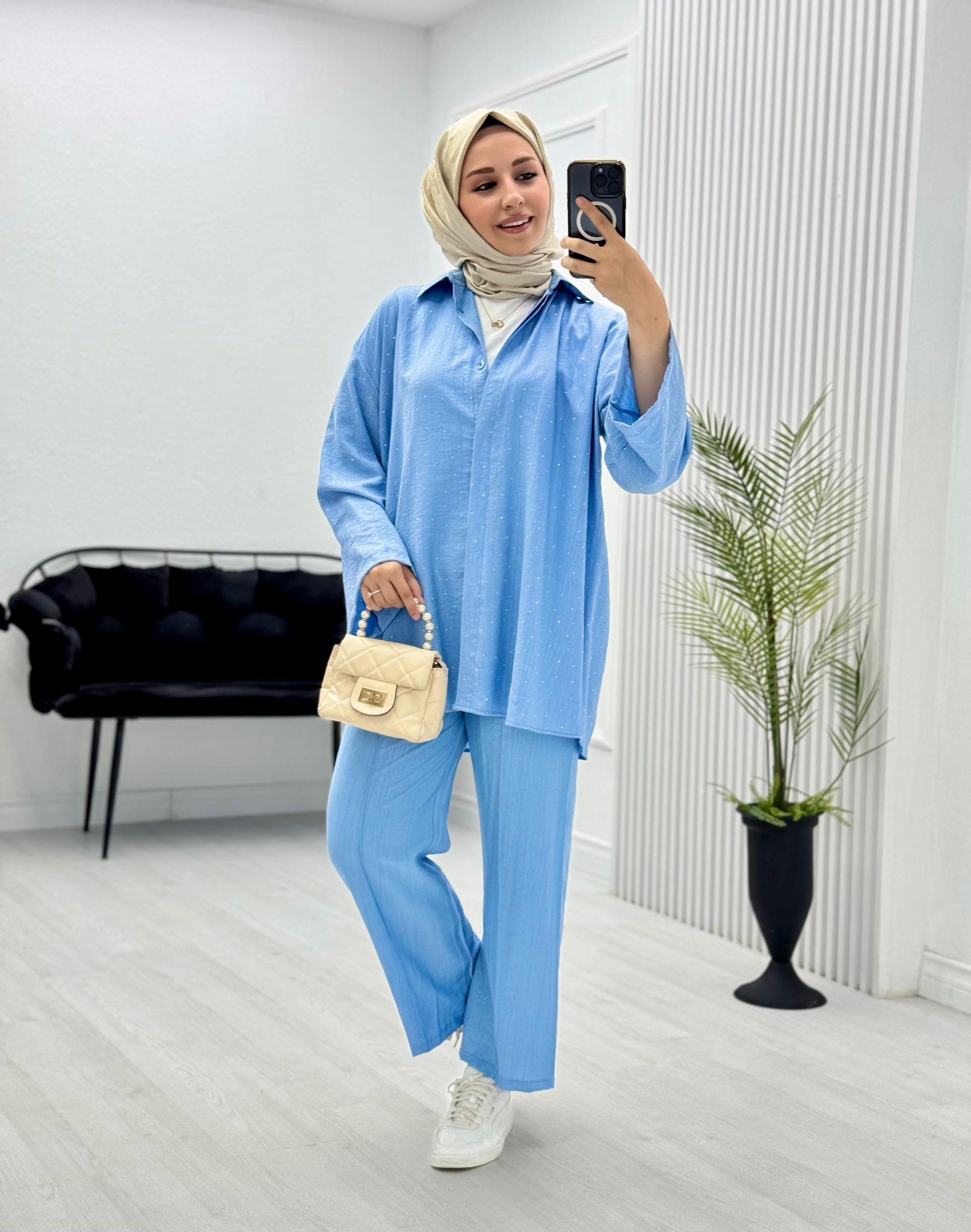 Günlük şıklığınızı tamamlayacak bu özel taşlı takım, zarif detayları ve rahat kesimiyle gardırobunuzun vazgeçilmezi olmaya aday.