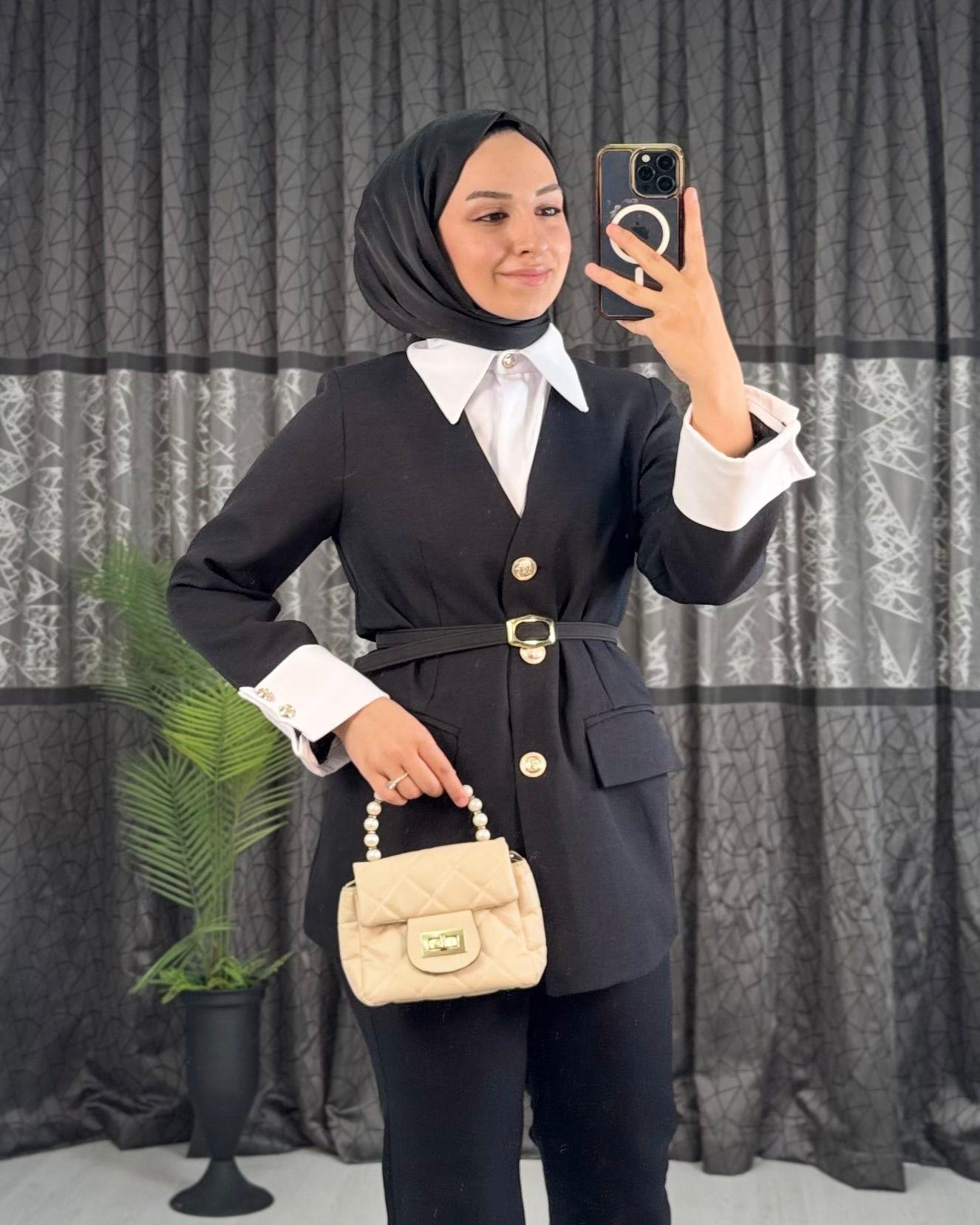 • Üst Kısım: Astarlı ceket, kendinden gömlek yaka tasarımı