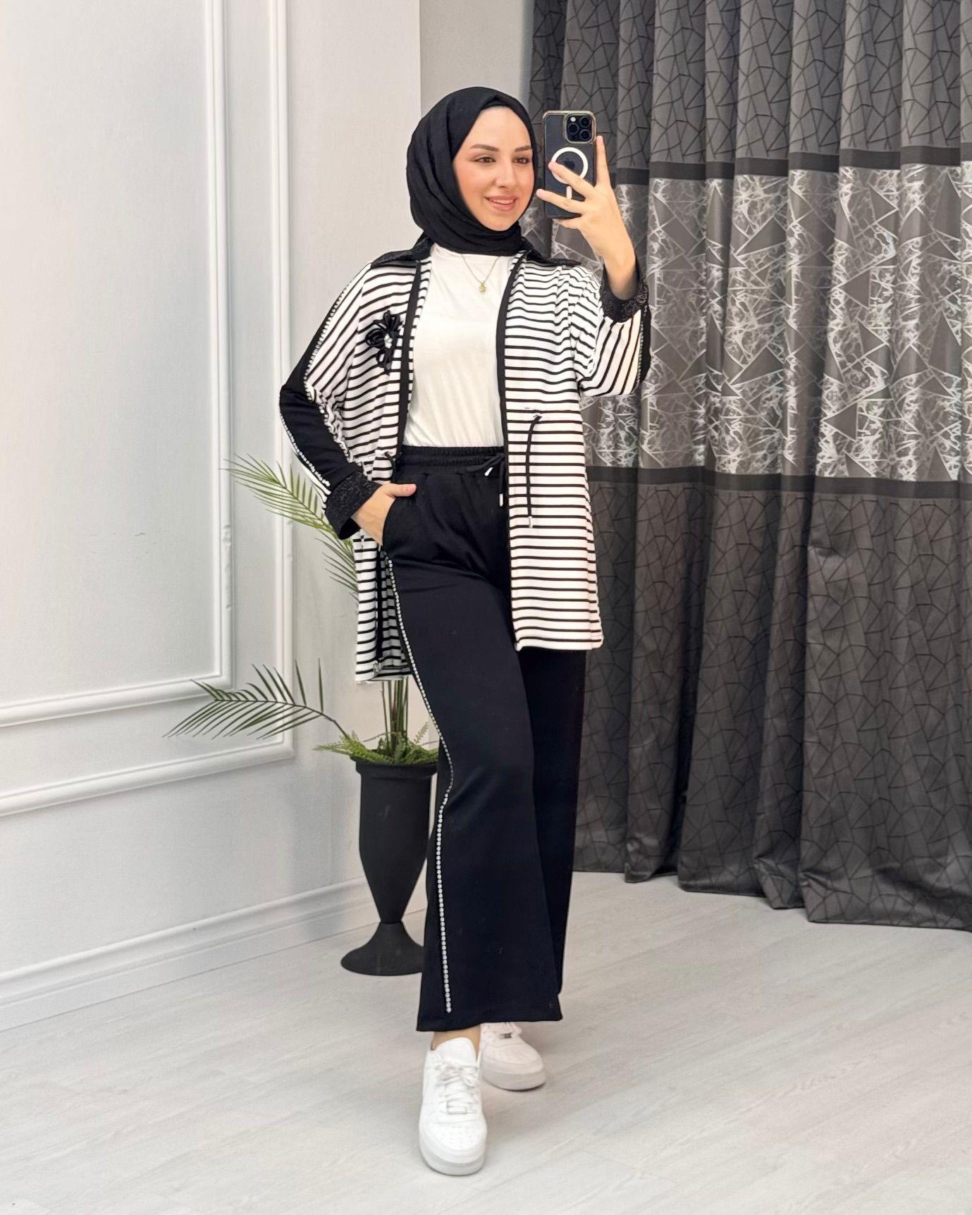 NOT: Premium kalite kumaş ve şık taş detaylarıyla özel günlerinizde rahatlıkla kullanabileceğiniz zarif bir takım. Tuniğin ayarlanabilir bel detayı ve pantolonun lastikli yapısı konfor sağlar.