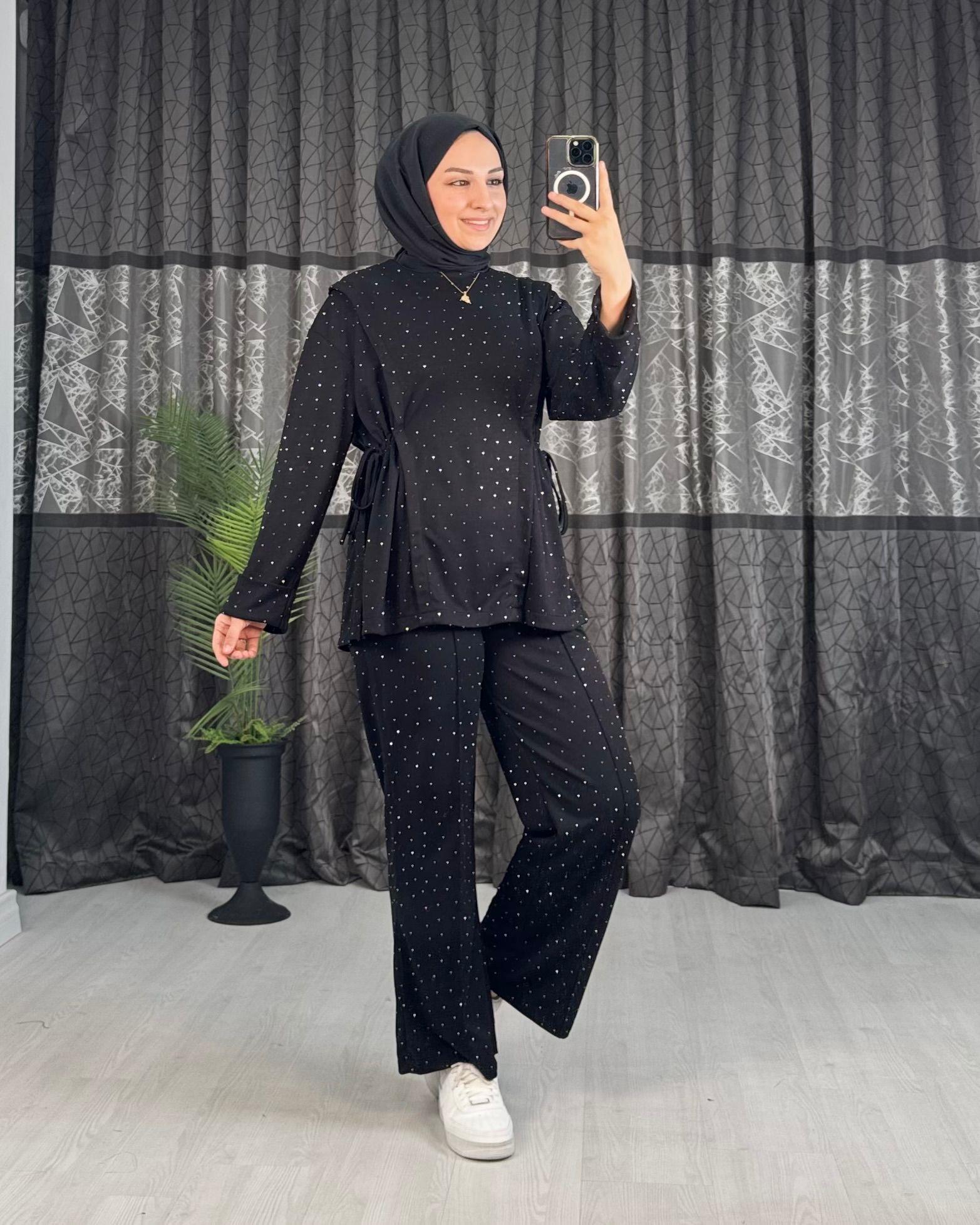 Oysho kumaşından üretilen bu şık takım, dayanıklı taş serpmeleri ve iki yandan bağlamalı detayları ile özel anlarınızda size zarif bir görünüm katar. Lüks detaylar ve modern tasarımın mükemmel buluşması.