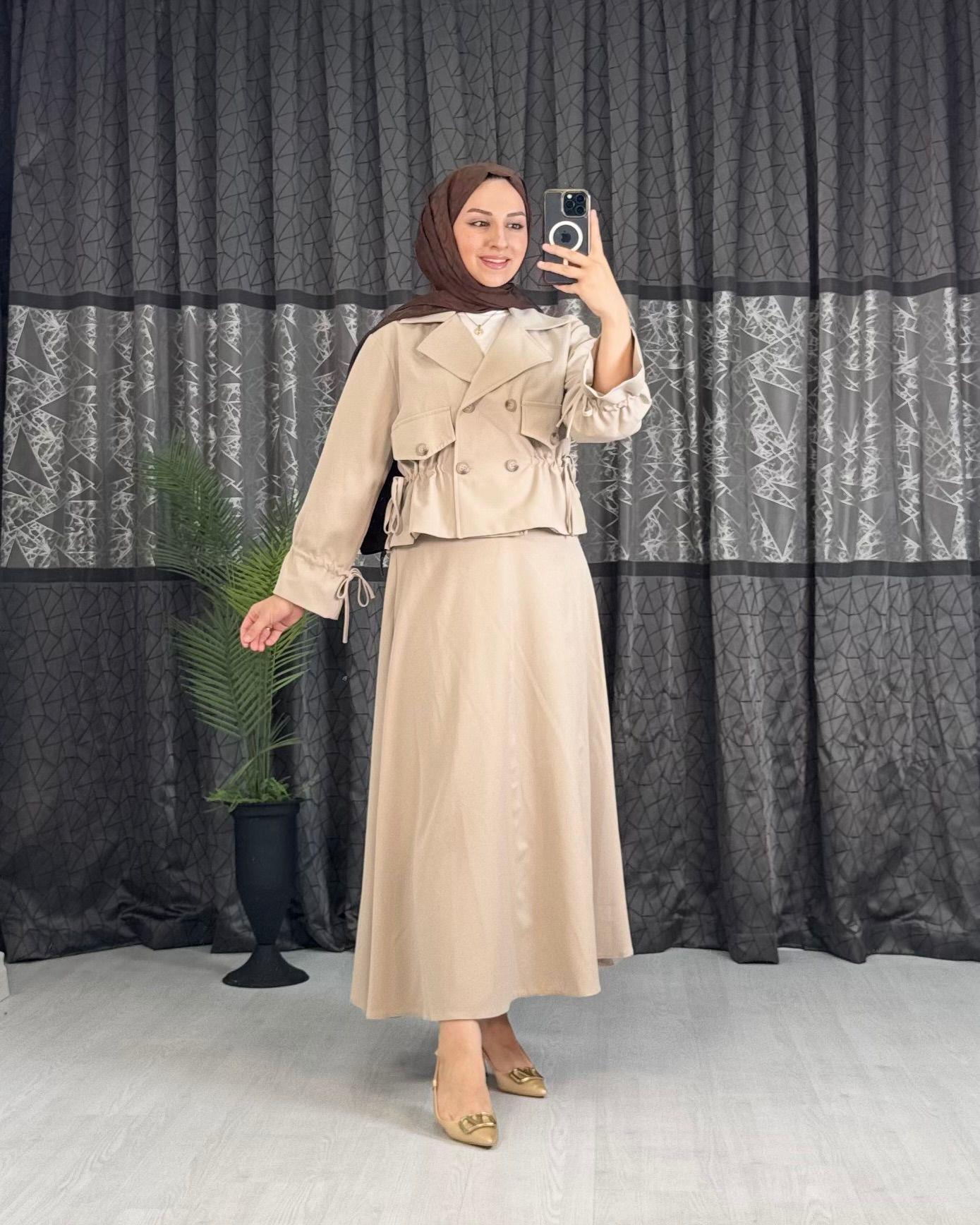 Krep kumaşından üretilen bu ikili gece/gündüz takım, trençkot ve etek kombinasyonu ile hem günlük hem de özel anlarınızda size eşsiz bir şıklık katar. Ayarlanabilir detayları ile kişiselleştirilebilir bir tasarım.