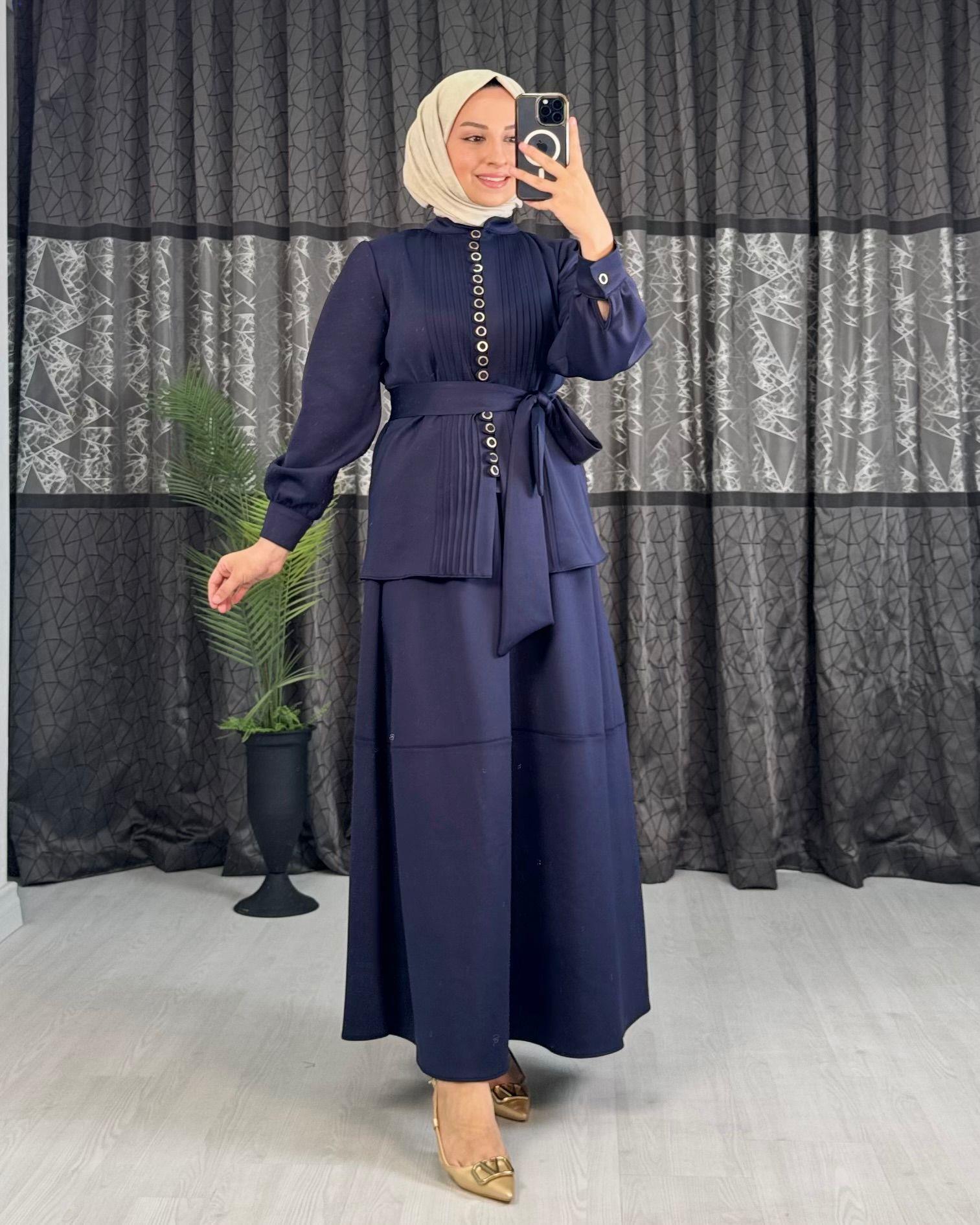Scuba kumaşından üretilen bu düğmeli takım, şık düğme detayları ve seyyar kemer ile modern kadının tarzını yansıtır. Hem konforlu hem de zarif bir görünüm sunan özel bir tasarım.