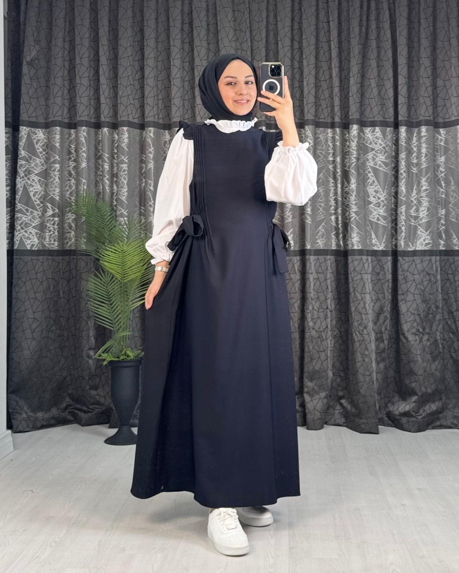 1. kalite krep kumaşından üretilen bu özel jile elbise, gömlekle birleşik yapısı ve mini fırfırlı omuz detayları ile feminen bir zarafet sunar. İki yandan bağlamalı modern tasarımı ile şık ve fonksiyonel.
