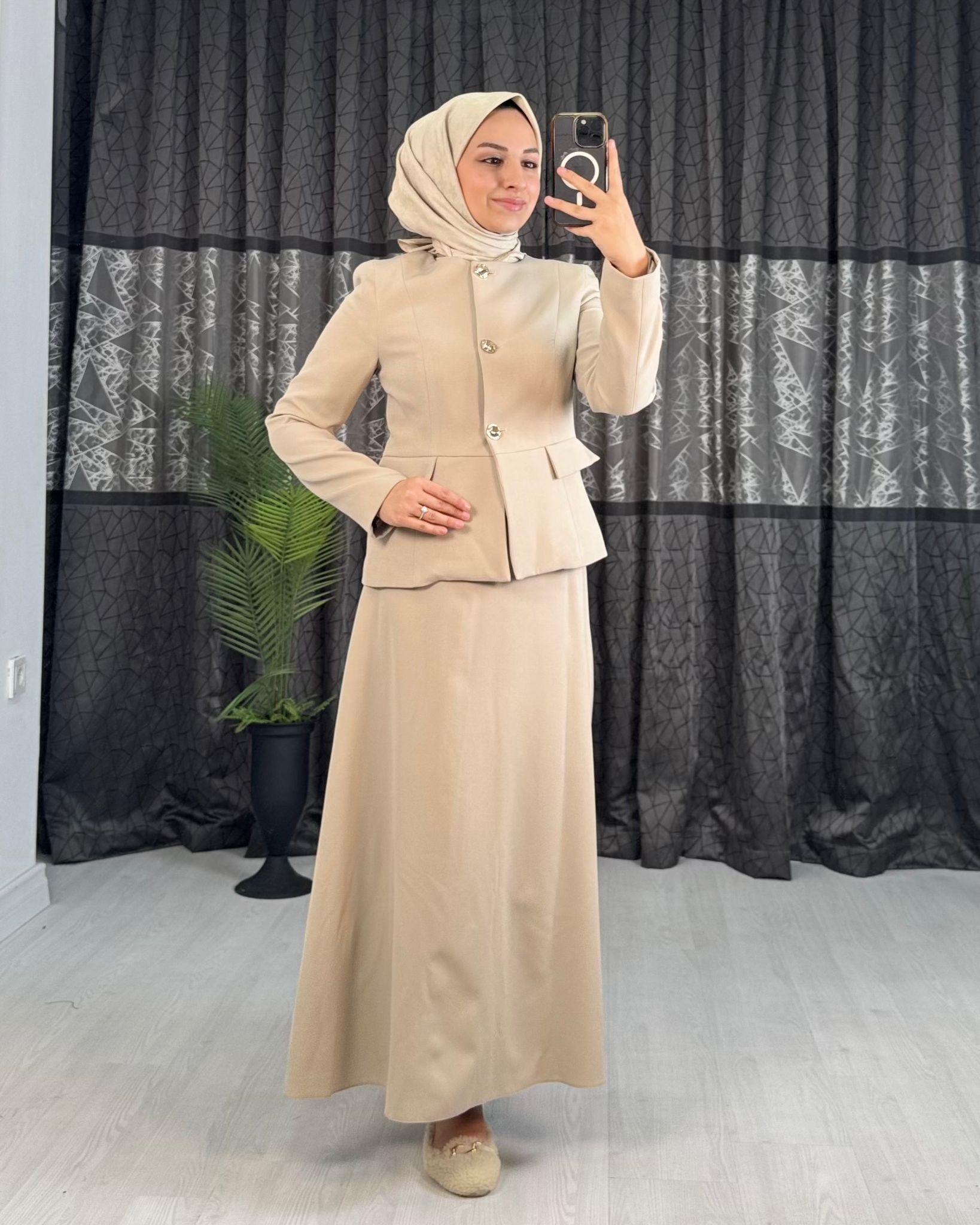 Krep kumaşından üretilen bu şık takım, düğmeli üst ve midi etek kombinasyonu ile timeless bir zarafet sunar. İş hayatından özel anlarınıza kadar her ortamda şıklığınızı tamamlar.