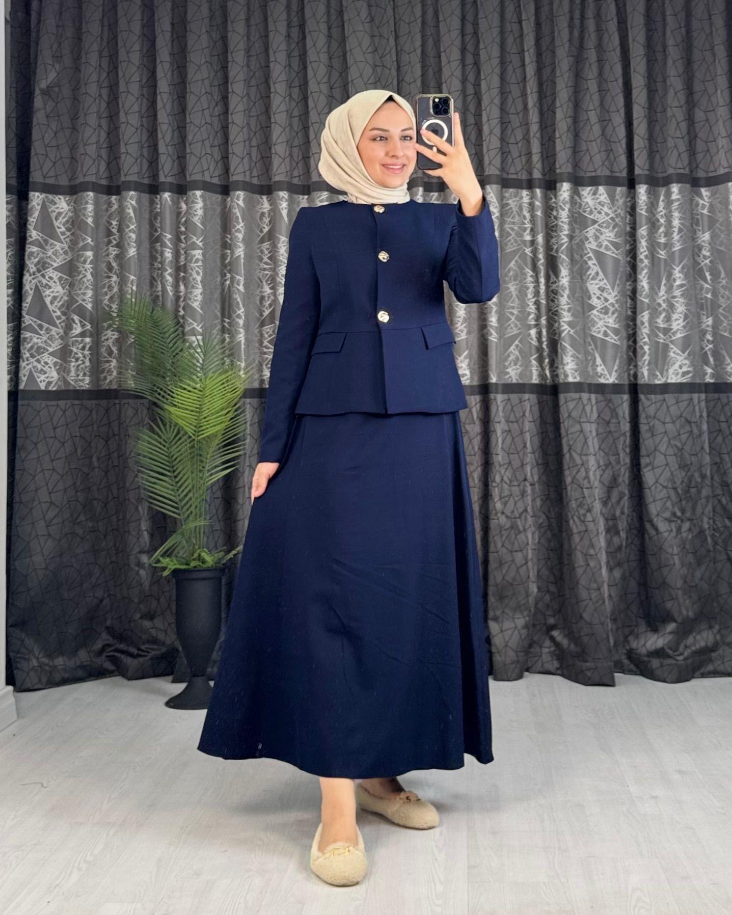 Krep kumaşından üretilen bu şık takım, düğmeli üst ve midi etek kombinasyonu ile timeless bir zarafet sunar. İş hayatından özel anlarınıza kadar her ortamda şıklığınızı tamamlar.