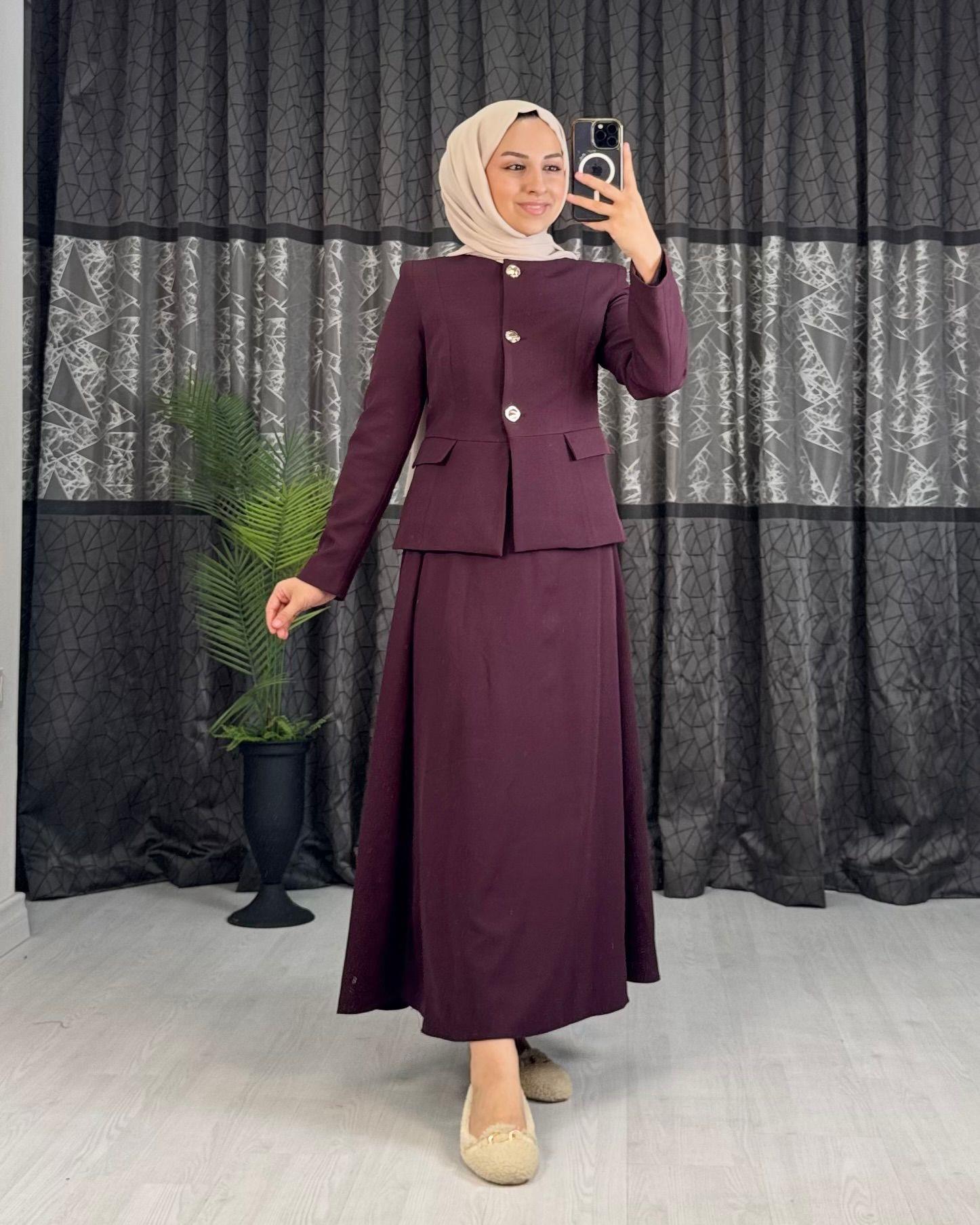 Krep kumaşından üretilen bu şık takım, düğmeli üst ve midi etek kombinasyonu ile timeless bir zarafet sunar. İş hayatından özel anlarınıza kadar her ortamda şıklığınızı tamamlar.